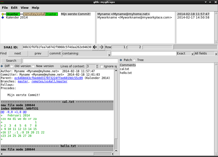 $ git add . $ git commit -m 'Mijn eerste Commit!' [master (root-commit) 8d84f9d] Mijn eerste Commit! 2 files changed, 9 insertions(+) create mode 100644 cal.txt create mode 100644 hello.txt